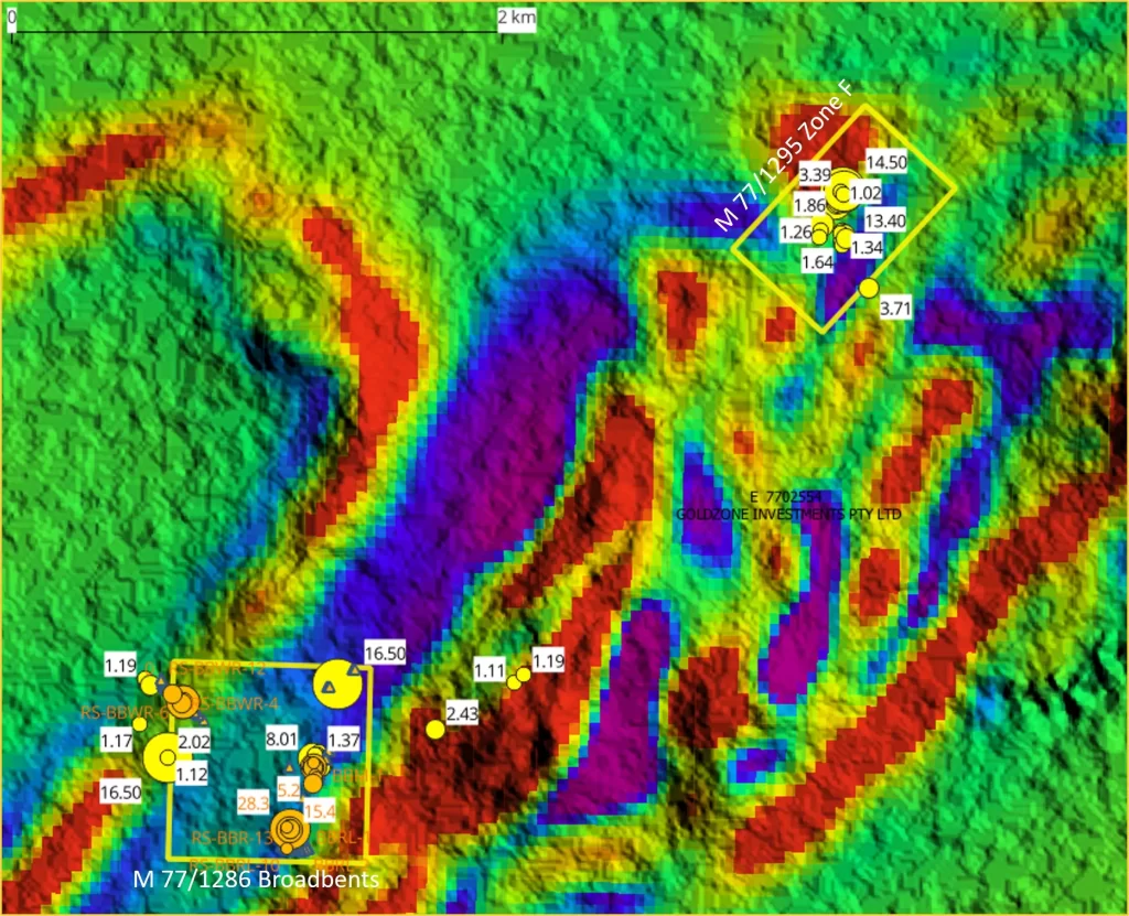 • Broadbents mine location and RAB drilling results align with edge of NE/SW trending magnetic anomaly – opportunity to investigate mine extension / infill between pits.